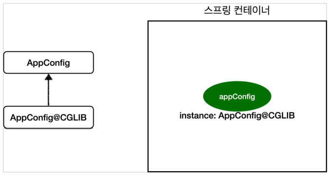 스프링은 CGLIB이라는 바이트코드를 조작하는 라이브러리를 사용해서 AppConfig 클래스를 상속받은 다른 클래스(AppConfig@CGLIB)를 생성한다.