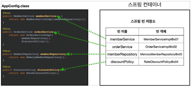 AppConfig.class에서 등록했던 빈 정보를 참고하여 스프링 컨테이너에 저장한다.